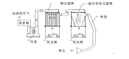 ① 兩級除塵,旋風(fēng)初效過濾+精過濾,兩級除塵可以大量清理、回收、像氧化鋁粉、水泥等較細的粉塵,也可以吸水、吸油。